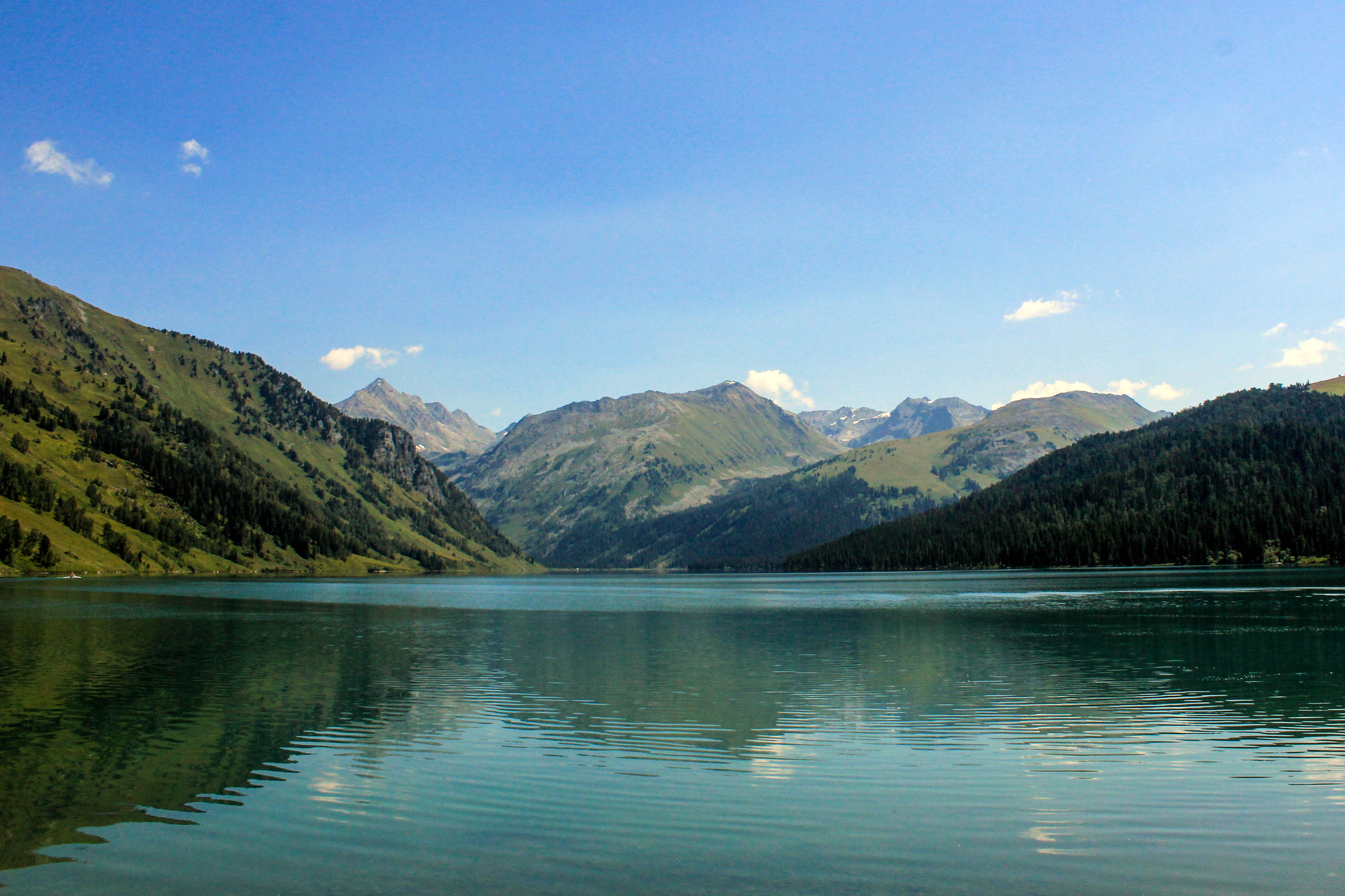 Дневка на Тальменном озере. Радиальный выход на водопад Солоуха. Дневка на Тальменном озере. Тальменье (Тайменье, Тальменное) озеро расположено на высоте около 1,5 тыс. м над уровнем моря на южном склоне западной части Катунского хребта в сотне километров от ближайшего населенного пункта. Это самое крупное озеро в верховьях Катуни длиной около полутора километров с максимальной глубиной до 68 м. Здесь водится хариус и ленок, реликтовая рыба, которую первооткрыватели приняли за тальменя. Озеро является памятником природы и входит в Катунский заповедник. В его окрестностях произрастает 15 видов редких растений и обитает около 30 видов диких животных, в их числе рысь, соболь и даже снежный барс. На западном берегу озера стоит кордон, где живут егеря. Здесь есть беседки, баня, деревянные домики для туристов, электричество, моторные лодки. Катунский хребет отличается тем, что летом здесь царит преимущественно теплая и солнечная погода. Берега озера пологие, а потому здесь спокойно можно купаться – в жаркую погоду вода прогревается в прибрежной зоне. Если погода позволит, то возможно совершить экскурсию на противоположный берег Тальменного озера. На моторной лодке группа отправится на восточный берег озера в заповедную зону. Прогулка по водной глади доставит массу положительных эмоций. Это красивое озеро с зеленовато-бирюзовой водой растянулось в длину на 5420 м. Котловина его была образована движением древнего ледника, который оставил в конце своего пути мореный вал, подпруживающий озеро. Максимальная ширина Тальменьего озера — 1080 м., а средняя — 700 м. Восточный берег пологий, густо порос лиственничным лесом с примесью кедра. Западный берег крутой, с лиственничным редколесьем и высокотравными субальпийскими лугами, на этом берегу есть участки отвесных скал с высотой до 100 м Противоположный берег создает впечатление абсолютной дикой природы. О существовании человека здесь напоминает лишь беседка, туалеты, а также запрещающие знаки – на берегу нельзя охотиться, приземлять вертолеты, разводить костры. Группа совершит прогулку протяженностью 4км вдоль русла реки к живописному водопаду с высотой падения около 40 метров. По договоренности с егерями возможна рыбалка на удочку.Последний переход на пути к озеру. Перевал Большереченский отличается довольно большой протяженностью и суровыми метео-условиями. Тропа частично каменистая, частично поросшая кустарником и травой. На вершине перевала даже летом возможен мокрый снег. Перевал Хариузовский довольно крут. Обычно его преодолевают пешком, ведя коней в поводу. Крутой подъем около 500-700 метров – и перед вами открывается удивительное по красоте озеро, бирюзовое и спокойное, словно пригоршня воды, зажатая между двумя хребтами, как в ладонях у великана.