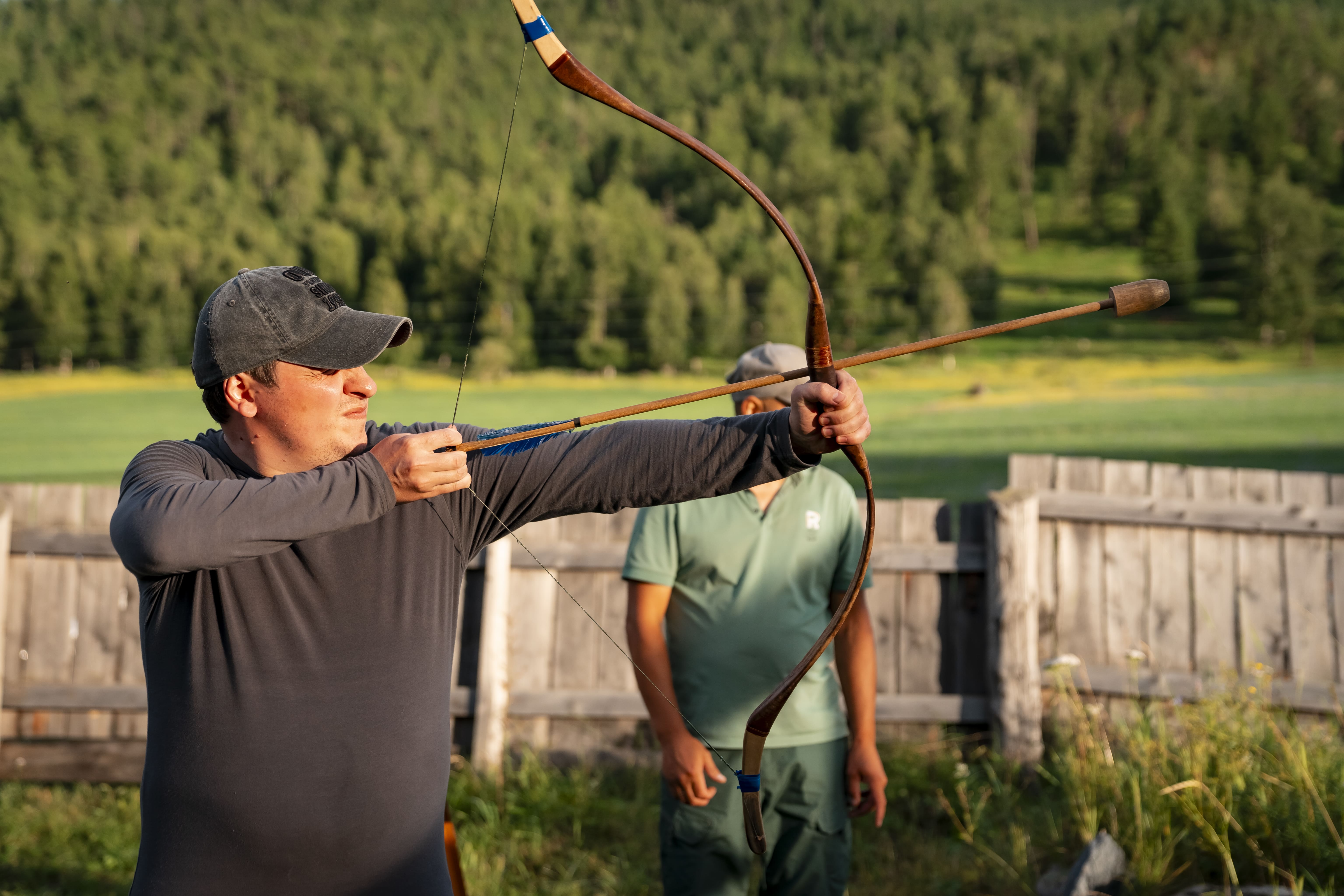 После отправляемся в обратный путь на стоянку. Ужинаем, моемся и спешим на очередной мастер-класс. Туристов научат стрелять из алтайского лука.
