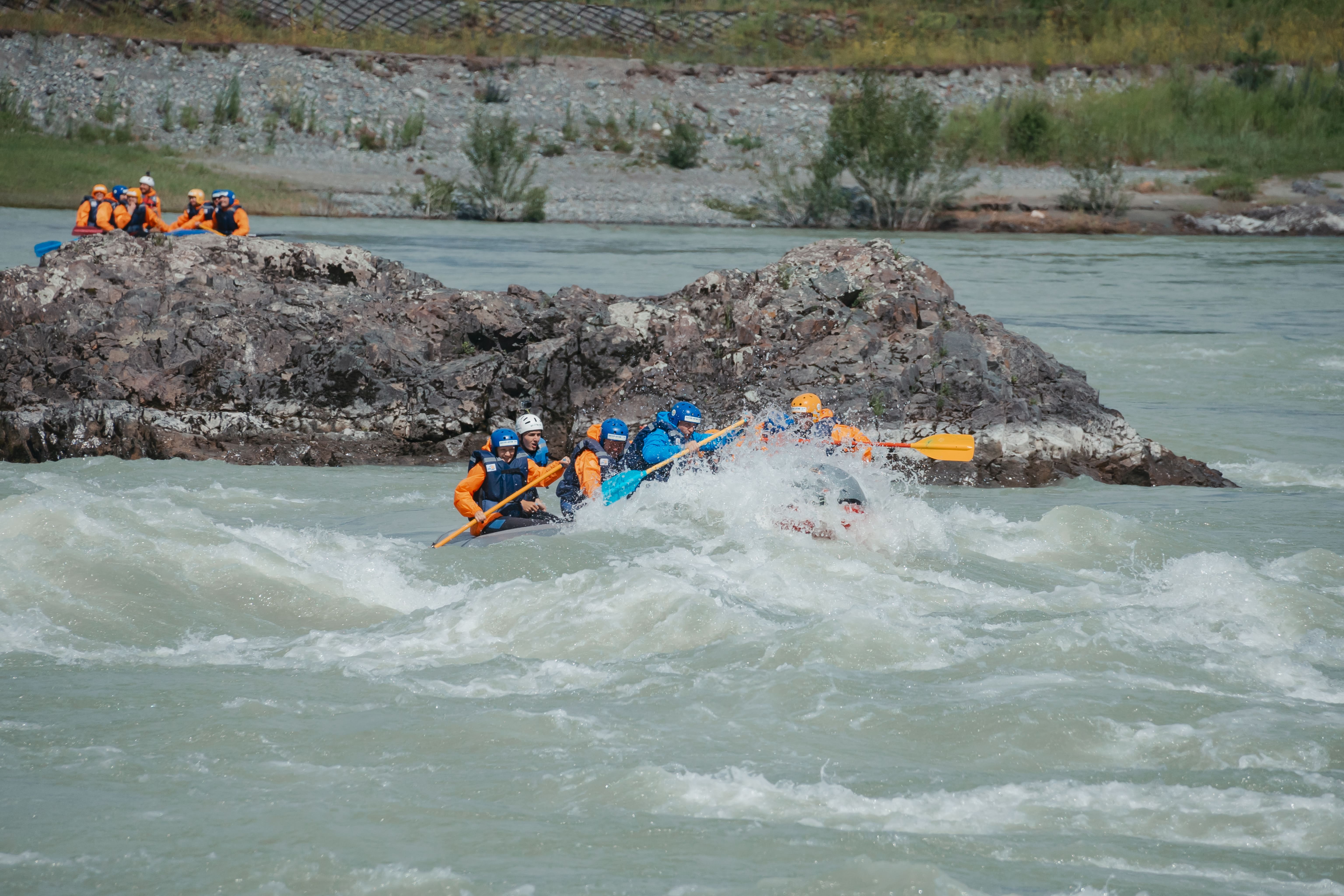 Знакомство с инструктором по рафтингу, получение снаряжения (гидрокостюмы, брызгозащитные костюмы, каски, жилеты). Инструктаж по технике водного туризма. Прохождение порогов Мунинский (2 кат.сложности), Манжерокский (2 кат. сложности), во время сплава туристы посетят Камышлинский водопад. Обед в полевых условиях (чай, бутерброды, сладости).Закончится сплав напротив эко-отеля "Таежник". Ужин в кафе “Таежник”. Окончание программы.