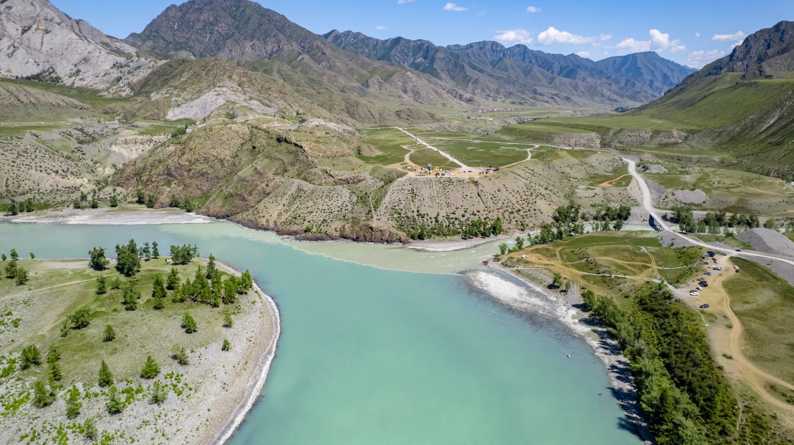 После обеда в кафе нас ждет подъем еще на один перевал - Чике-Таман. Дорога к вершине захватывает дух, поскольку подъем более резкий, а повороты более крутые - такой серпантин преодолеет не каждый начинающий водитель. А какие виды открываются то слева, то справа! Добравшись до верхней точки перевала, прогуляемся на обзорную площадку с видом на старый Чуйский тракт. Вернувшись в автобус, продолжим путь к месту слияния рек Чуя и Катунь. Буквально можно увидеть, как одна река соединяется с другой, угадав линию слияния по цвету воды. Это заметно даже на фото.